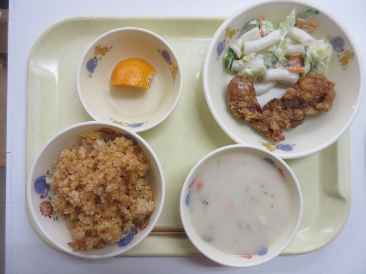 本日はクリスマス会に合わせて、年長組のリクエスト献立です。ケチャップライス・鶏の唐揚げ・マカロニサラダ・みかん・鮭シチューとクリスマスらしい献立となっています。