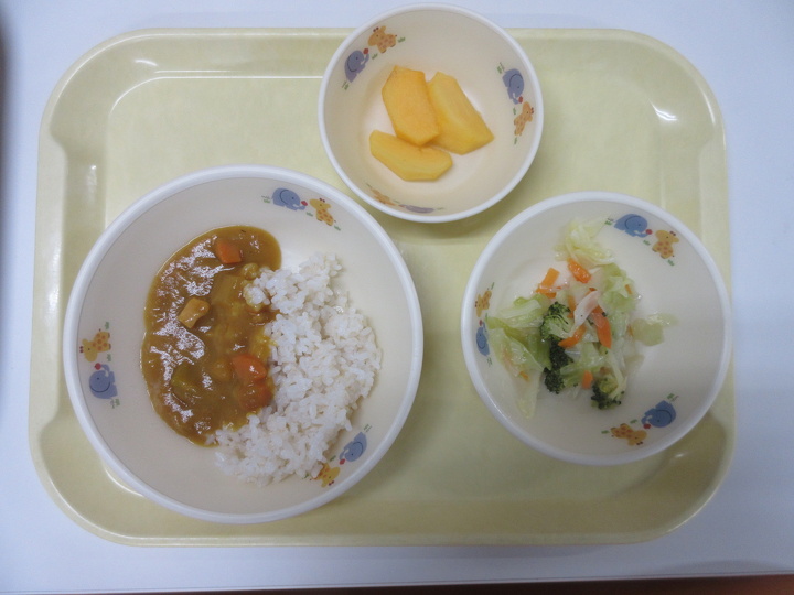 本日はハロウィンに合わせて、園児から人気のカレーライスに南瓜を入れました。南瓜の甘みを感じる美味しいカレーとなっています。
