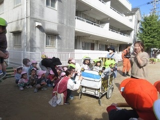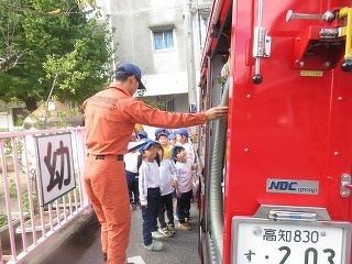 そして、記念写真を撮った後、消防車を見学させてらって「このホースはとっても長~いんだよ」等と説明もしてもらって子どもたちは興味津々で目が輝いていました。