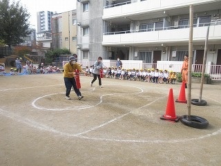 「火事で~す!」と言いながら、急いで火元のコーンまで走って消火をしました。