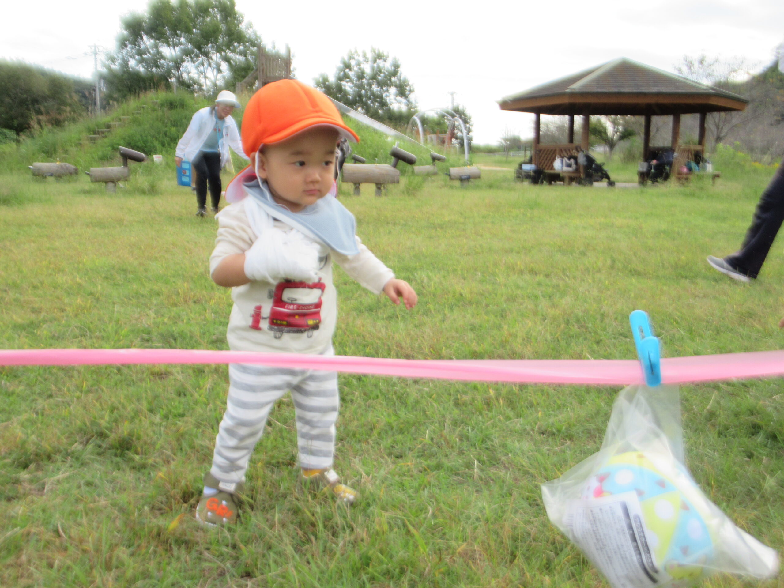 まずは、クラスごとで体を動かして楽しみました!りす組は、ゴールにあるボールを目指して歩きました!手をつないで歩いたり、ニコニコ笑顔で上手に歩いていましたよ!