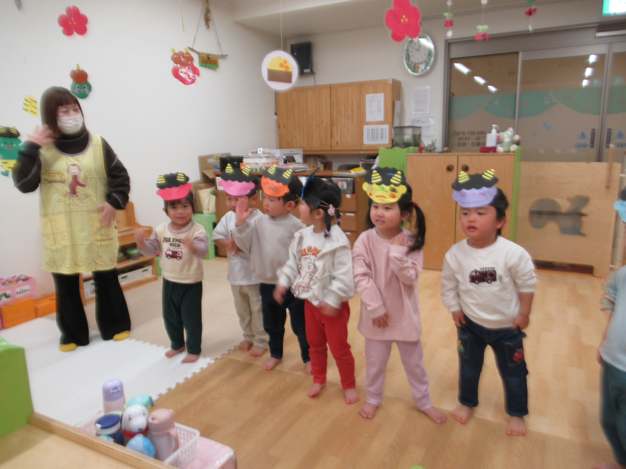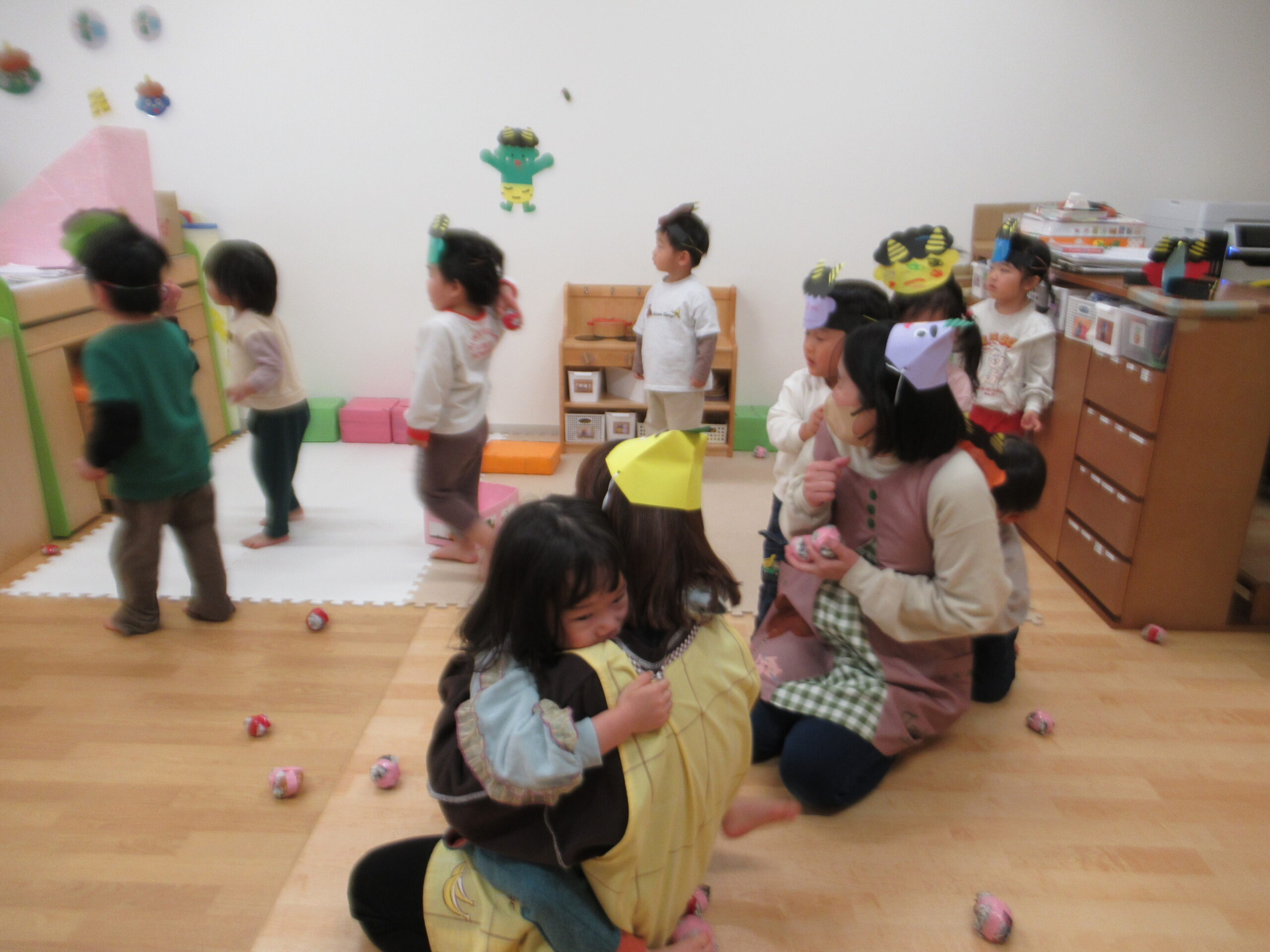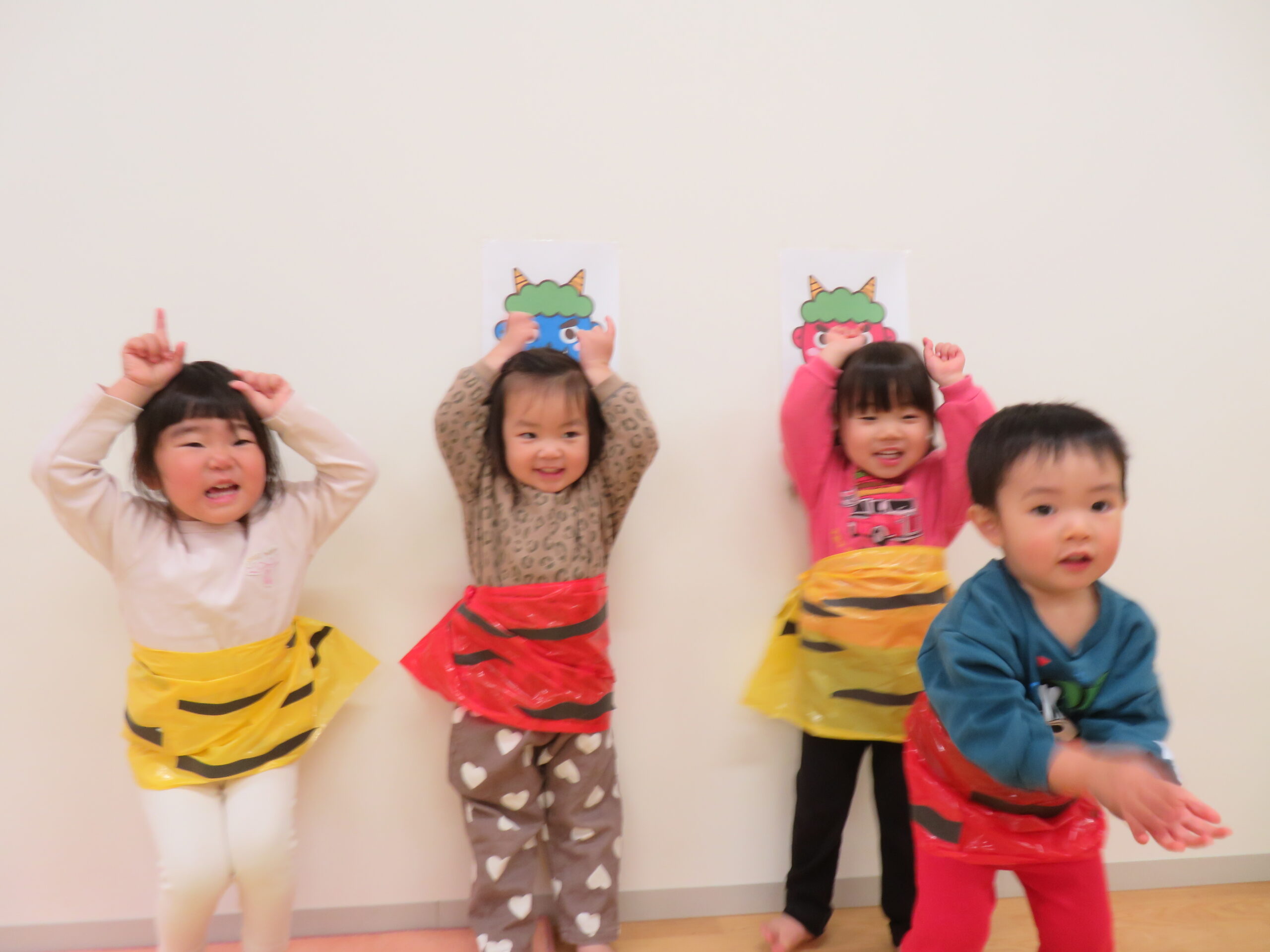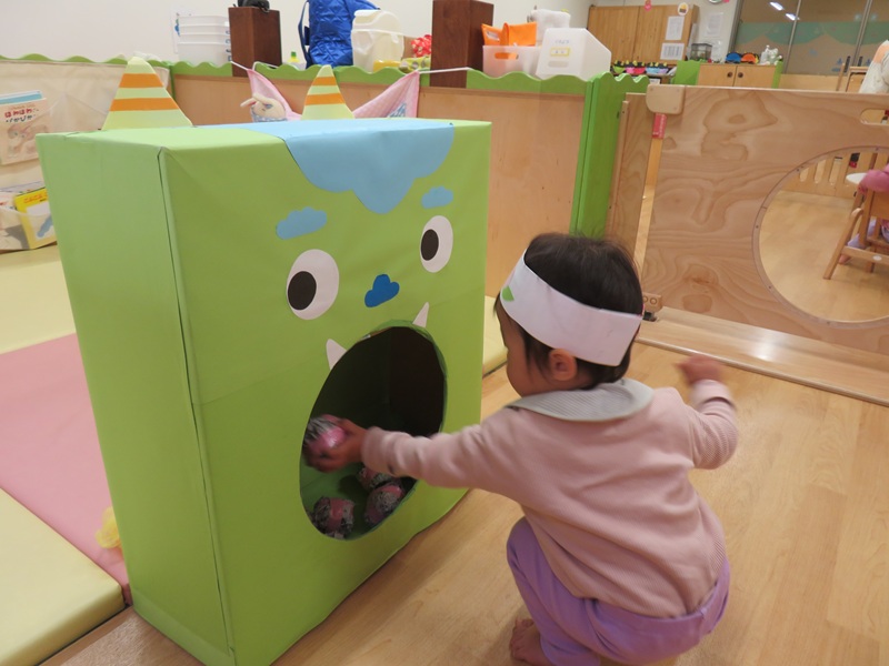 2月3日(火)、さくらんぼ園では恒例の豆まきがありました。新聞紙で作った豆を投げたり、鬼のパンツのうたを楽しく踊ったりしていました。