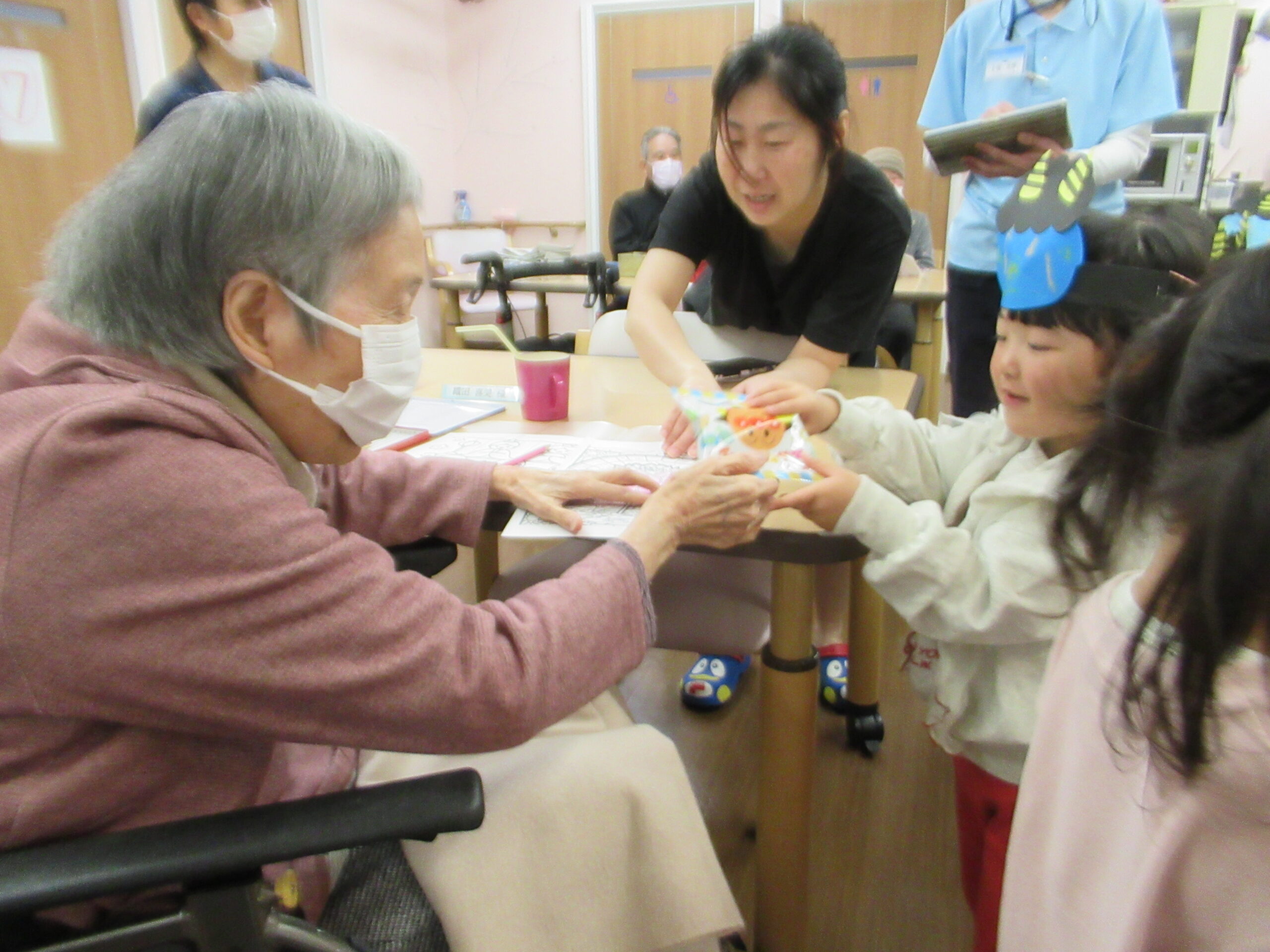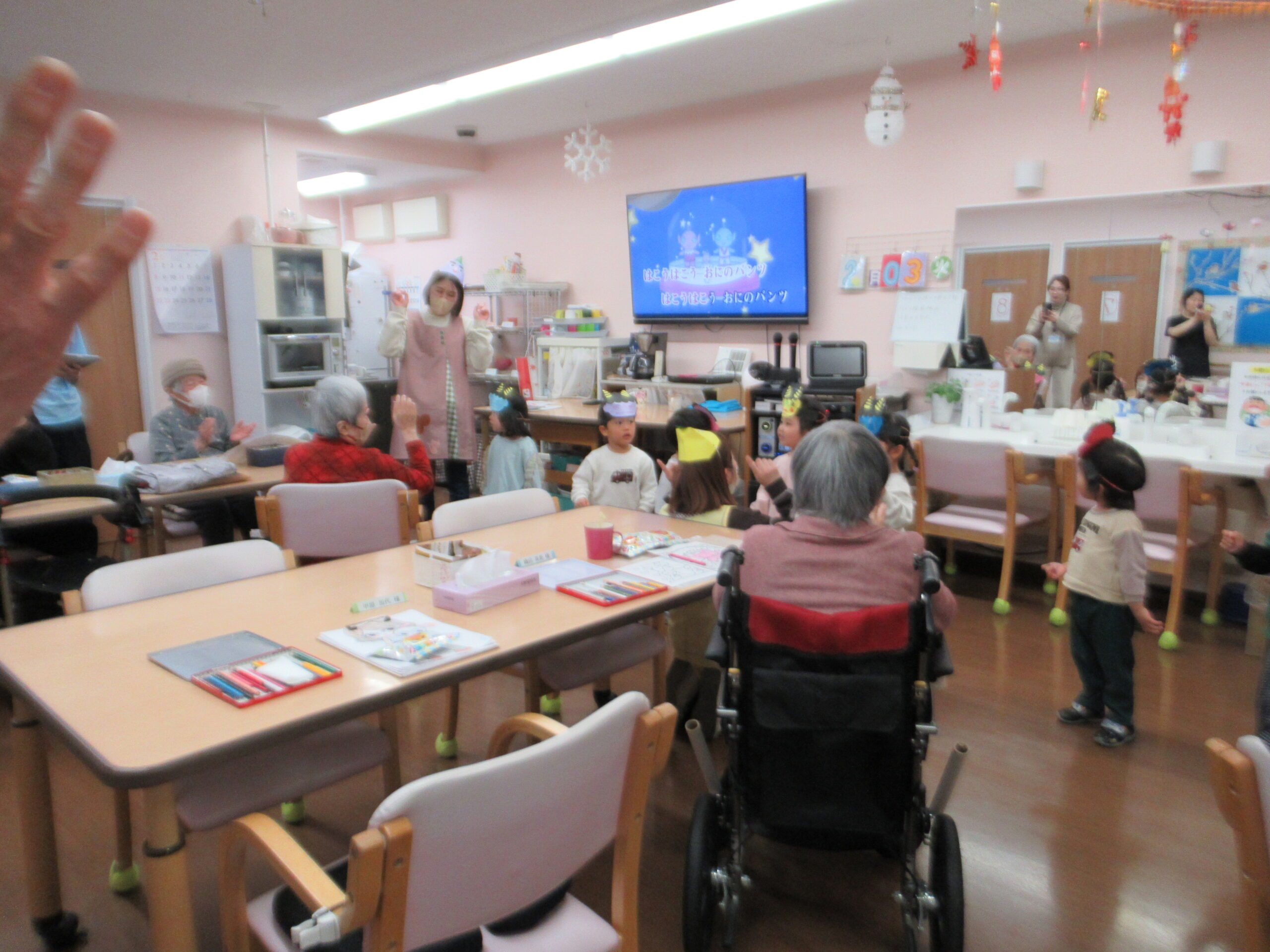 2歳児くま組の子どもたちは、同じフロアーのデイサービスでうたを披露するので、みんなの前で一回練習しました。本番では緊張しましたが、おじいさん、おばあさんたちにたくさんの拍手と笑顔をもらったことでした。帰りにはご褒美にアンパンマンのお菓子をいただきました。