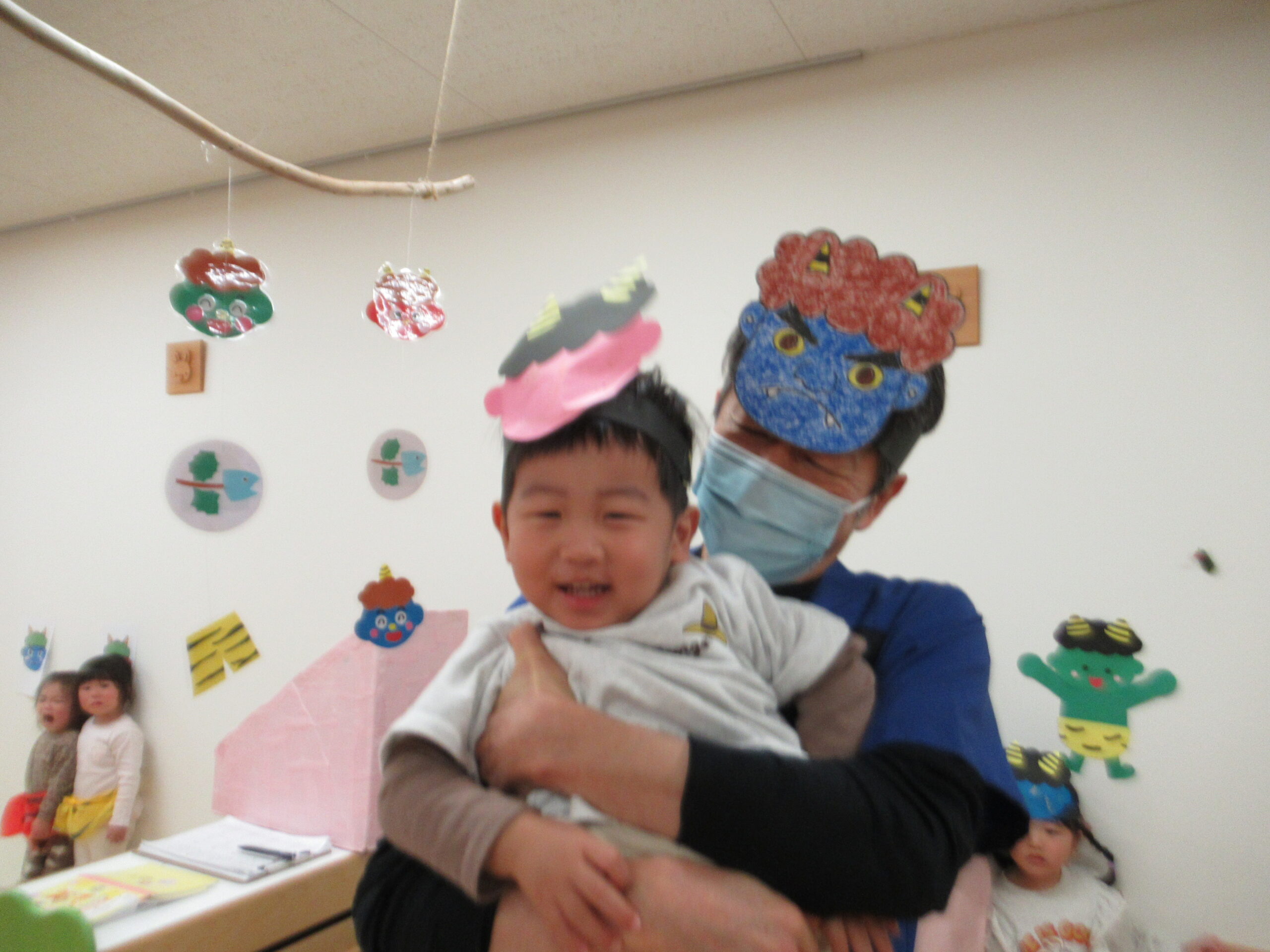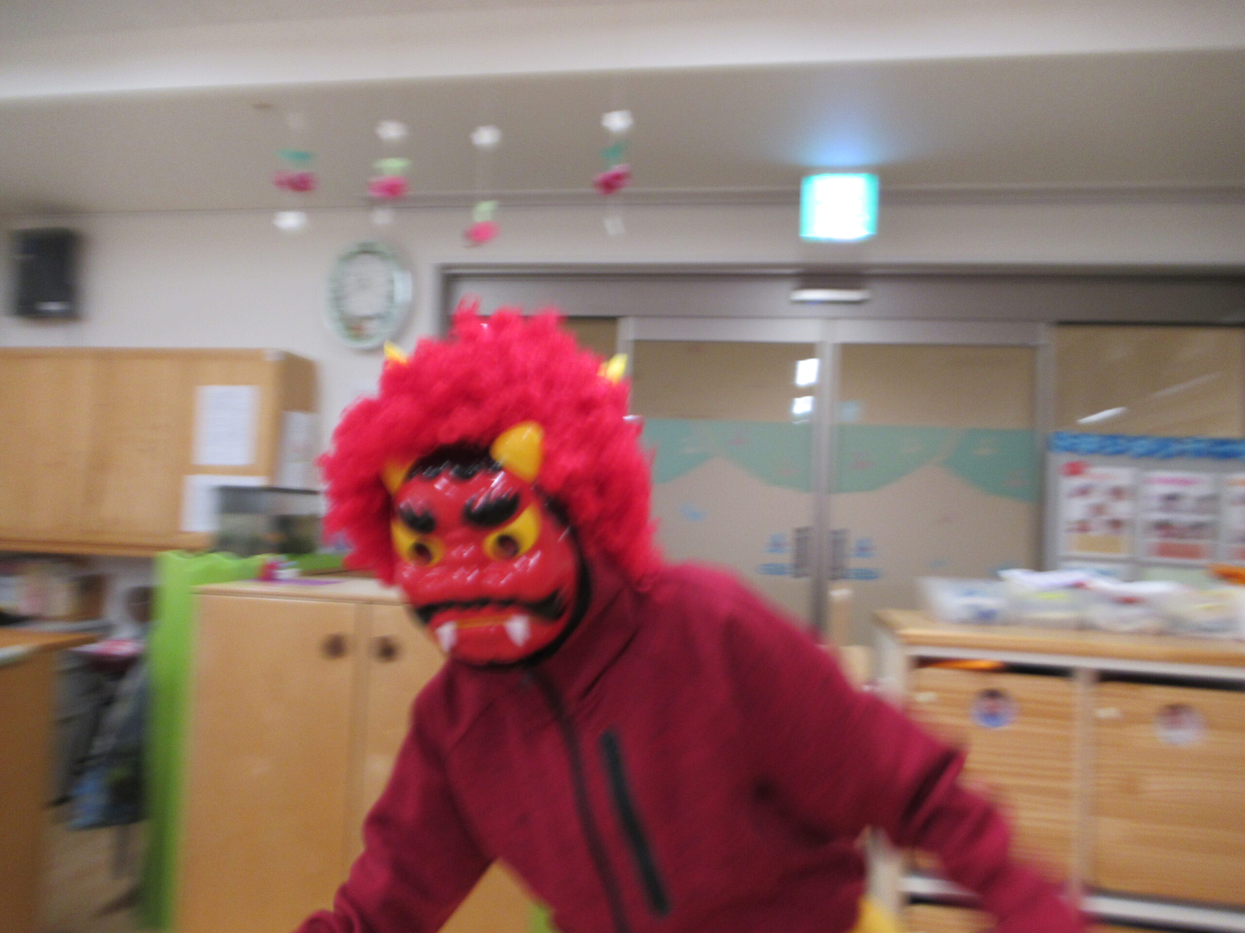 園に戻って、豆まきごっこを楽しんでいたら、青鬼が登場。よく見たら、同じフロアーのクリニックの先生でした。